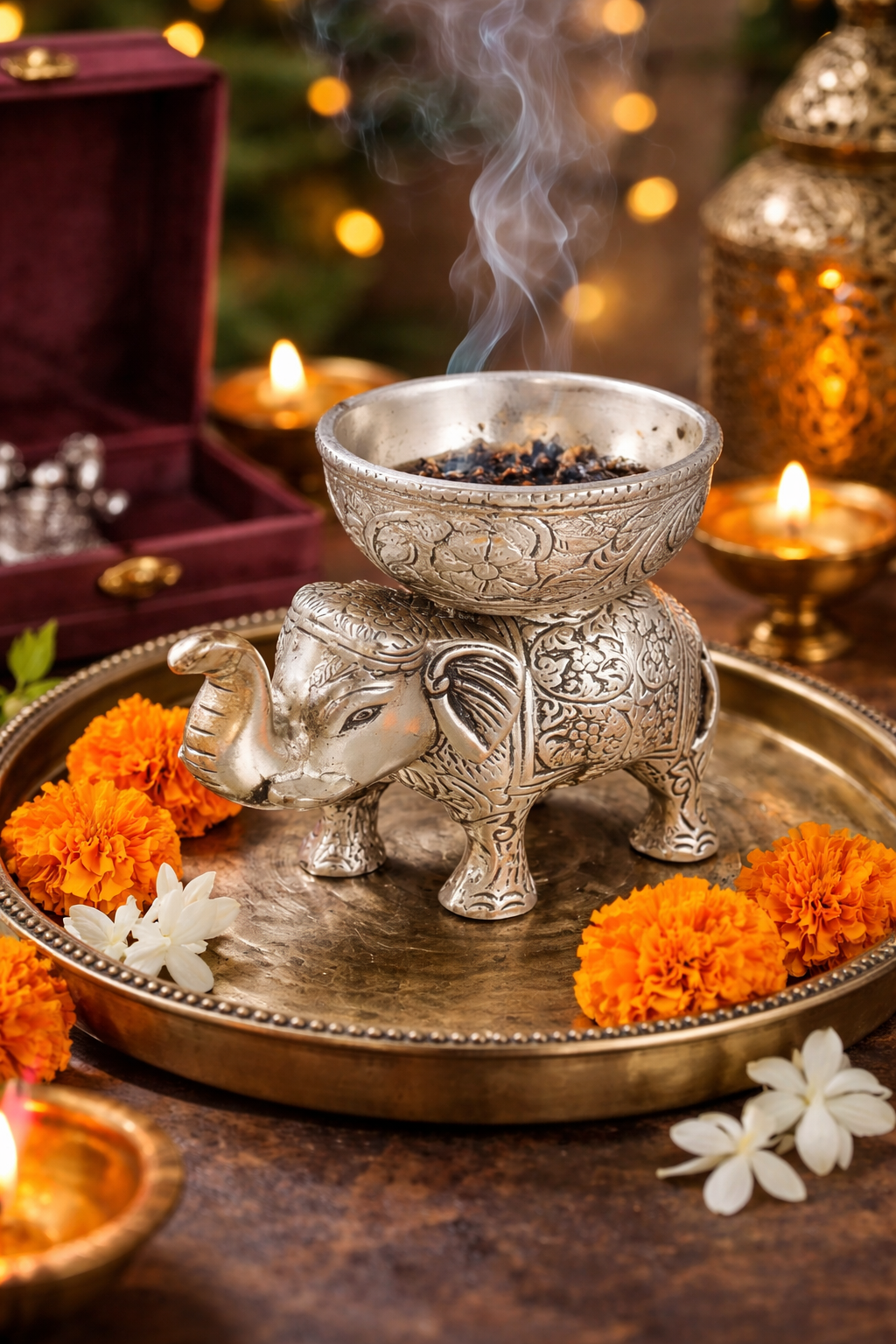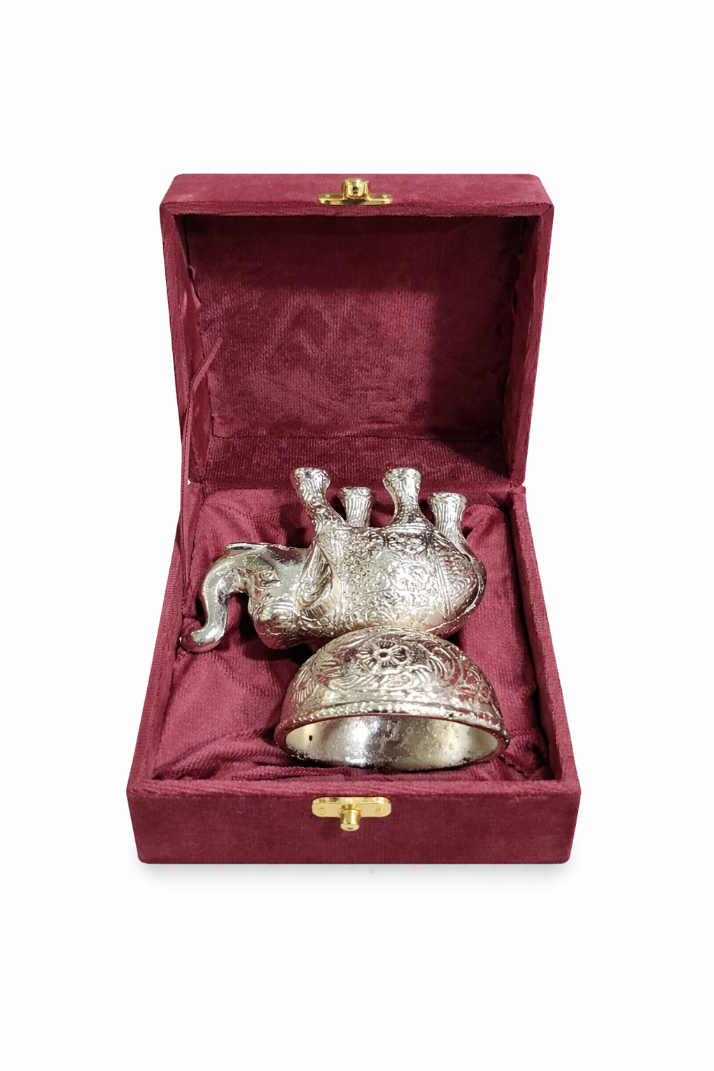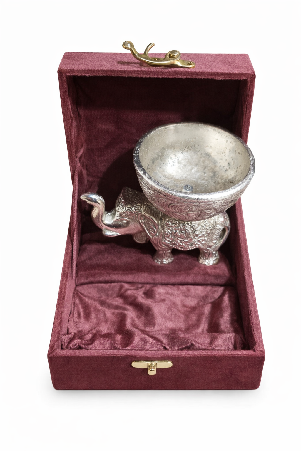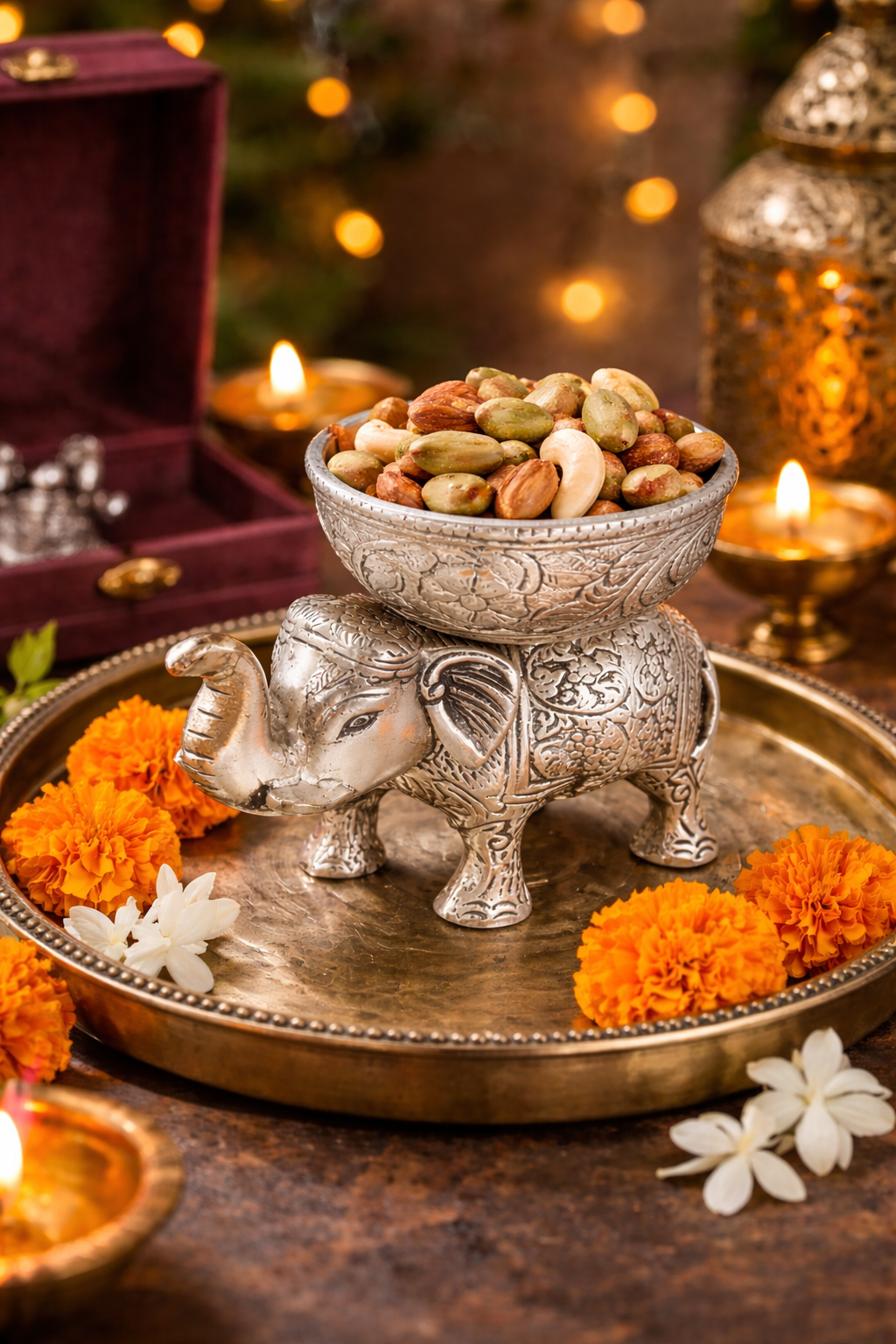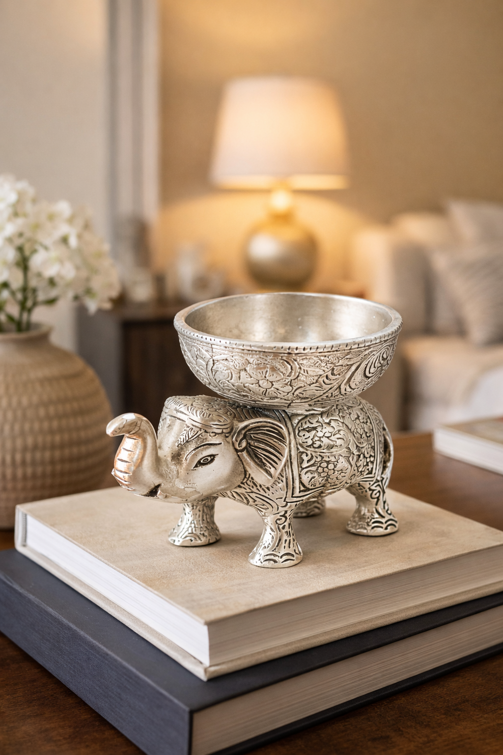 - Naturra by Silver Elephant Decorative Bowl (Set of 1) is a handcrafted metal bowl with an auspicious elephant base, ideal for pooja rituals, kumkum, prasad, diya use, festive décor, and elegant gifting.
